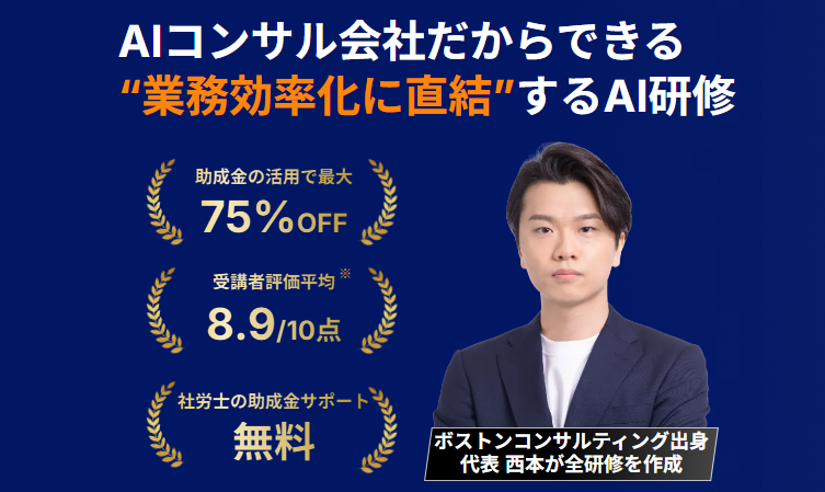 また、今なら助成金活用で最大75%OFFと大変お得にご利用いただける、AI総研のAI活用研修サービスがご好評をいただいています。1人4000円/月~で1人10時間以上/月の業務削減実績もあるAI研修サービスにご興味のある方は、以下のリンクからサービス資料をダウンロードいただけます。