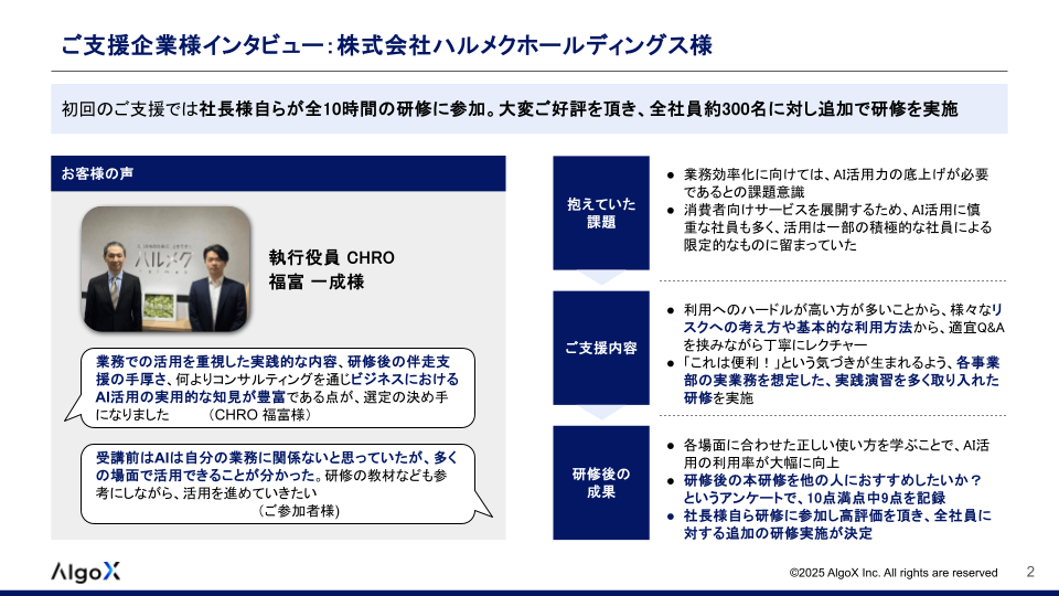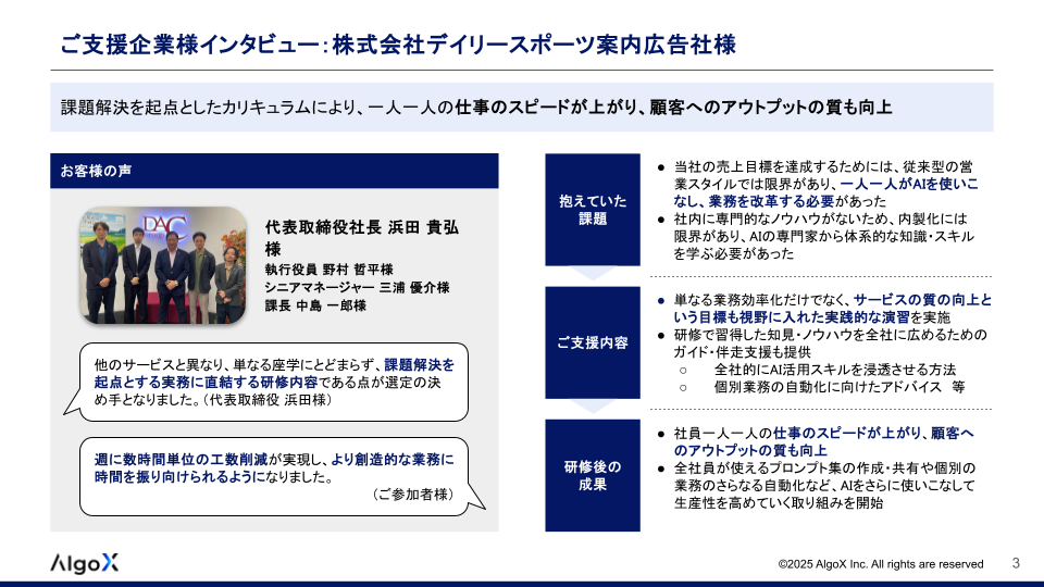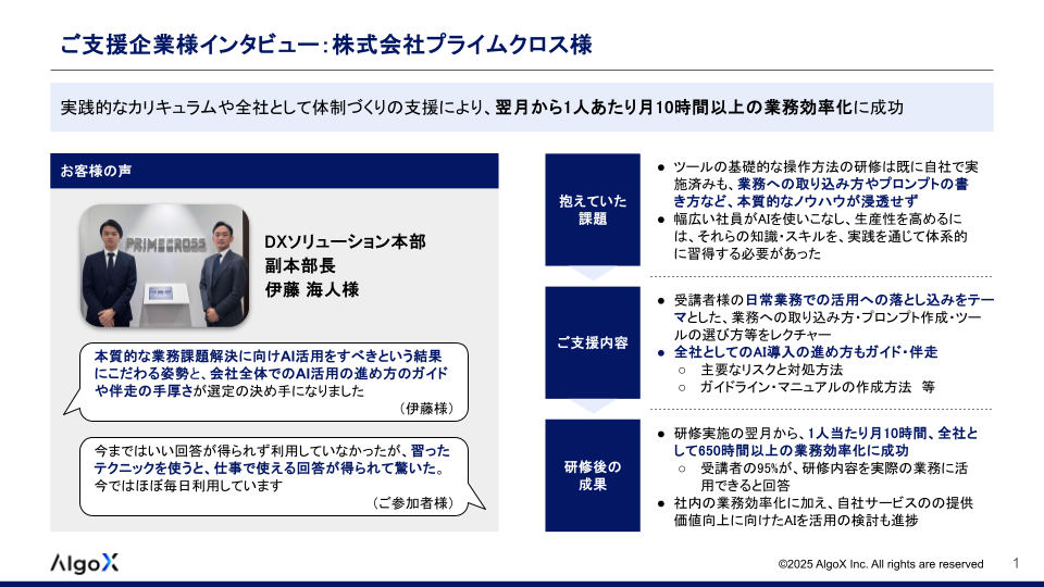 といった課題を抱える数多くの企業様に、AI/ChatGPT研修サービスをご利用いただき、大変ご好評をいただいております。